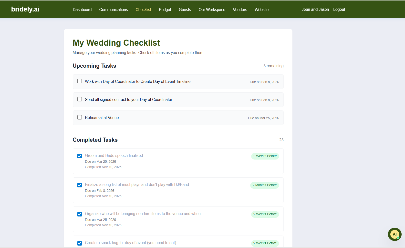 You don’t have to create this timeline on your own. Bridely.ai automatically builds your personalized planning timeline and guides you step-by-step through every phase. No spreadsheets, no guessing, no overwhelm — just clarity.