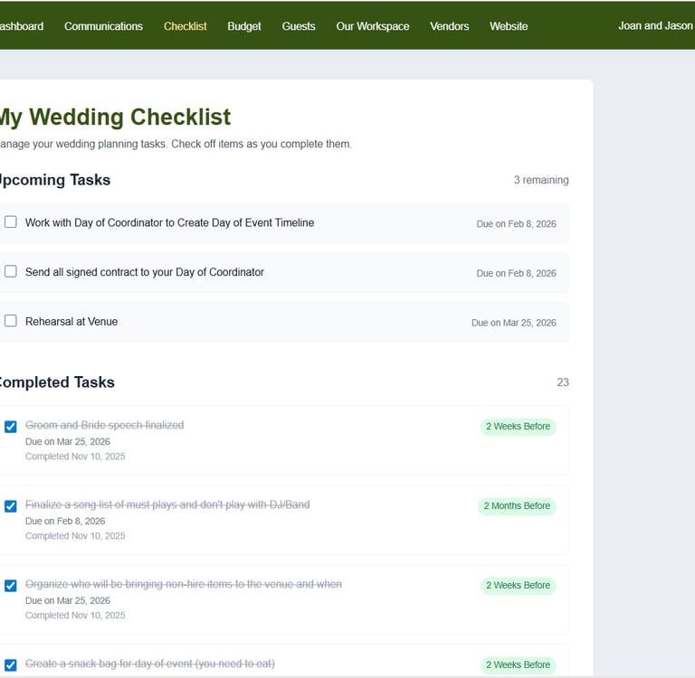Then they break those into smaller tasks — booking major vendors, designing the layout, managing RSVPs, finalizing décor, and more. This structure keeps you focused, prevents last-minute scrambling, and makes the entire process feel manageable.